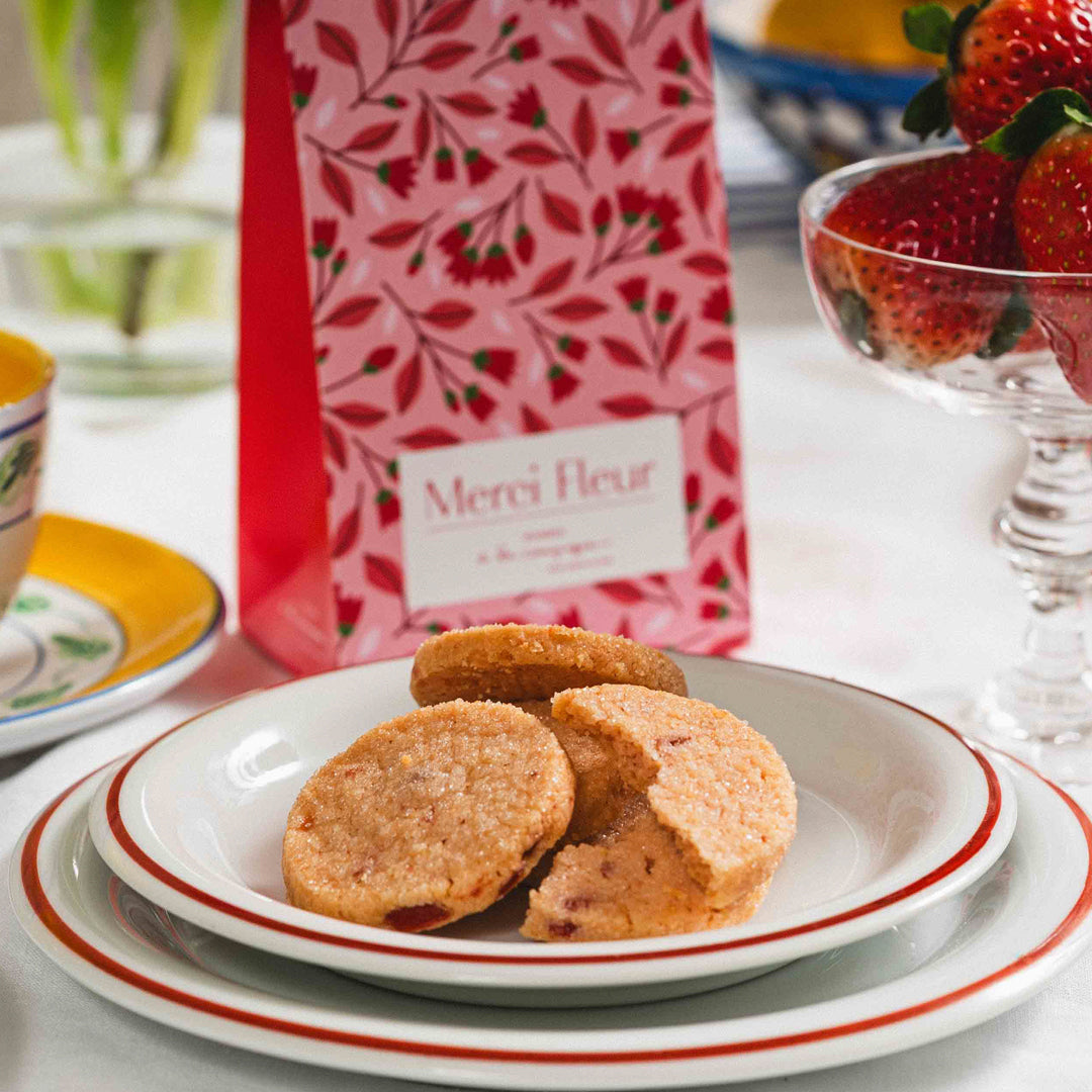 ザクっと食感のクッキーは甘酸っぱいイチゴ味。生地に練りこんだドライストロベリーでイチゴ感アップ。