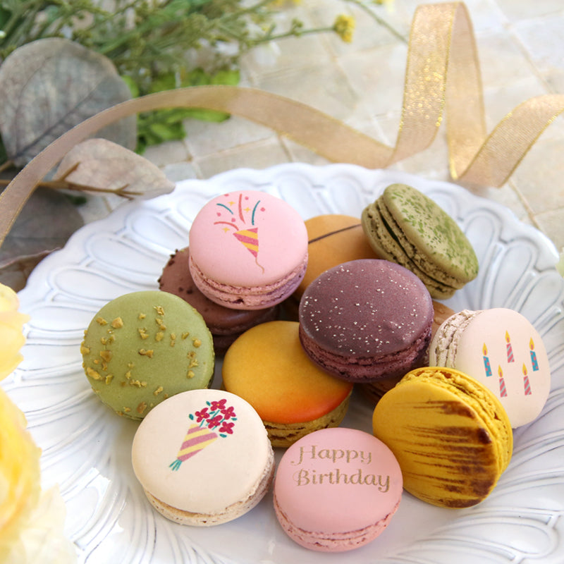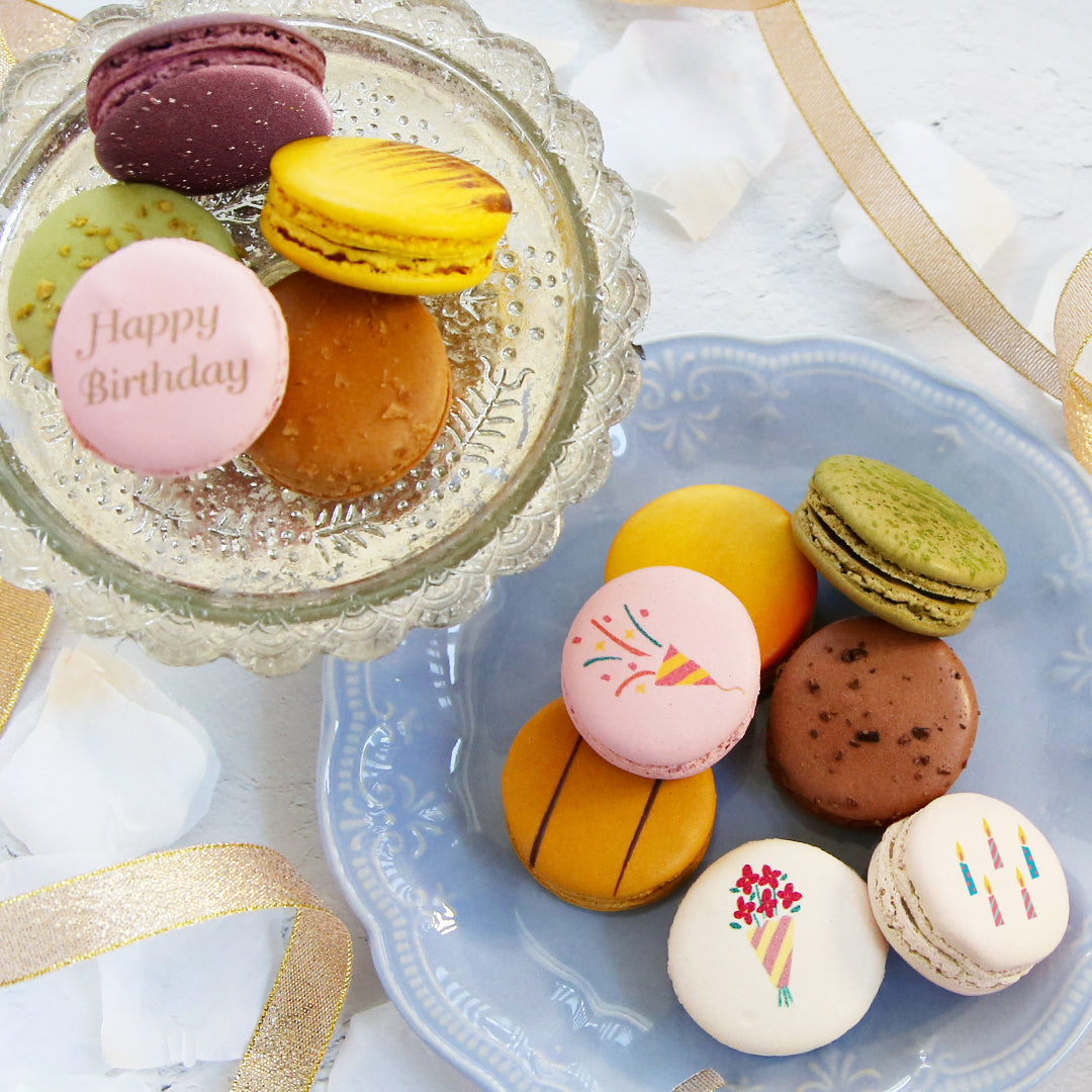 グラモウディーズの定番フレーバー10種のマカロンに、バースデーの贈り物にぴったりなかわいい柄をプリントしました。