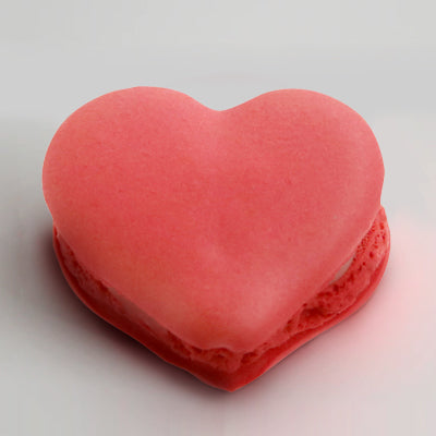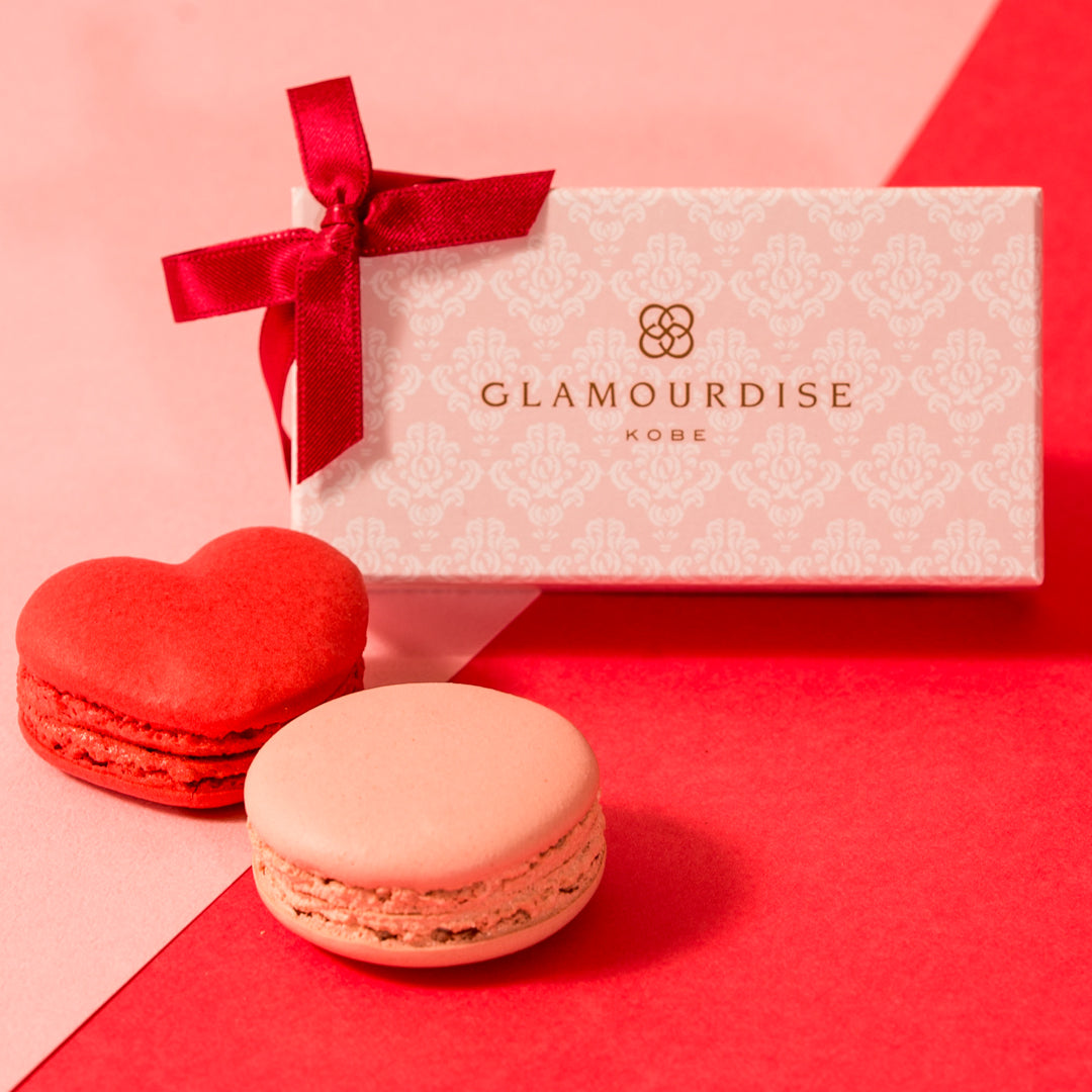 ⾚いハートのマカロンはストロベリーガナッシュ、ピンクのマカロンはミックスベリーのガナッシュ。カラフルなマカロンでバレンタインを楽しんで。